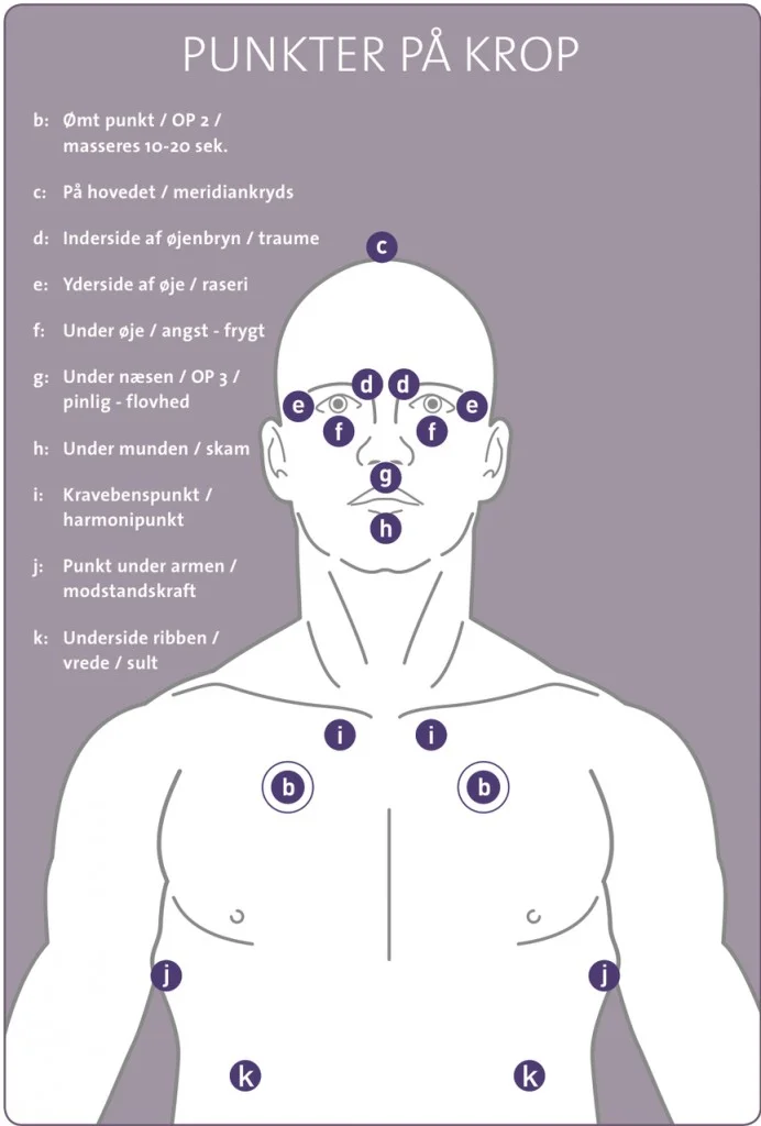 Med let bankende bevægelser på specifikke punkter på din krop skabes energi, der kan hjælpe med at frigive traumer. Min opgave er at skabe forbindelsen imens vi udforsker dét traume, du gerne vil arbejde med, hvor det sidder i din krop, og hvordan det føles. Jeg guider dig gennem processen med det formål at fjerne det ubehag, du oplever. Nogle gange kan et traume løses i én session, mens det andre gange kræver flere sessioner, især hvis der er flere traumer forbundet med den samme kilde til stress eller ubehag. I starten kan det føles lidt underligt, men de fleste mærker hurtigt, hvordan kroppen reagerer på TFT/EFT, også kendt som Terapeutisk tapping.
